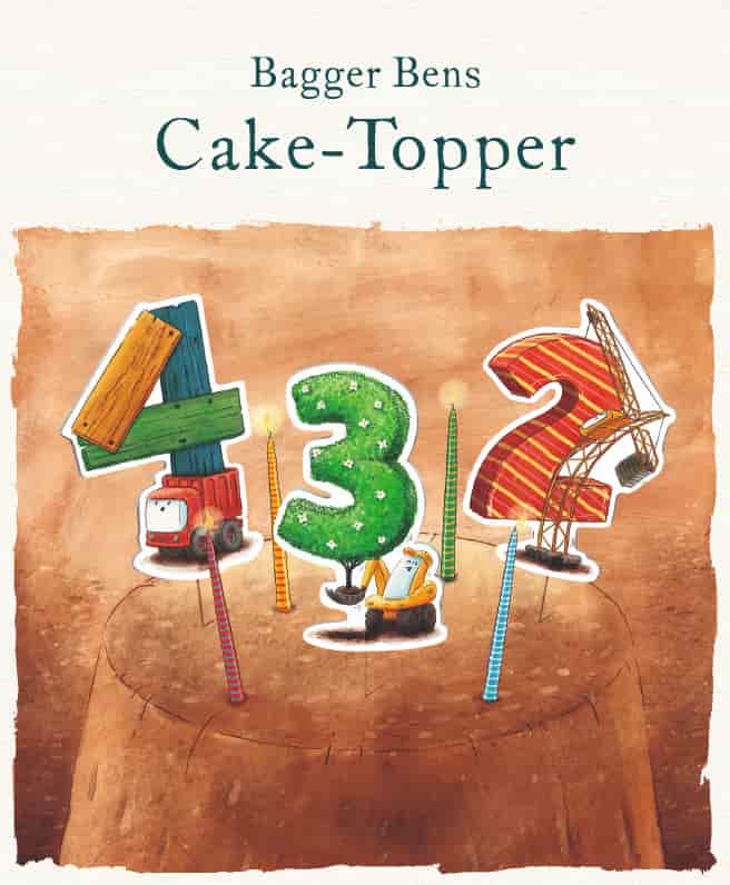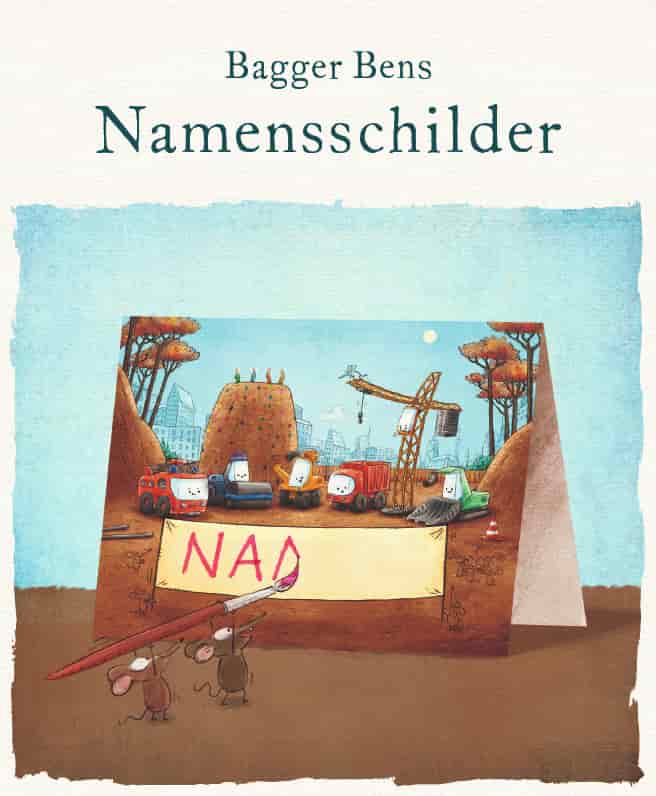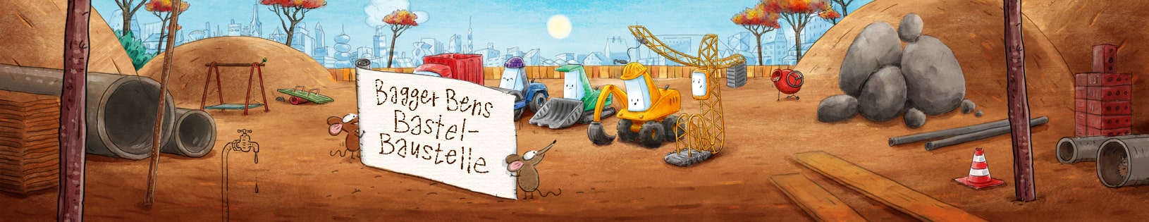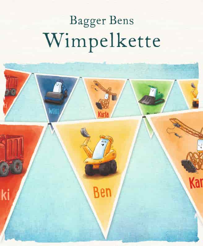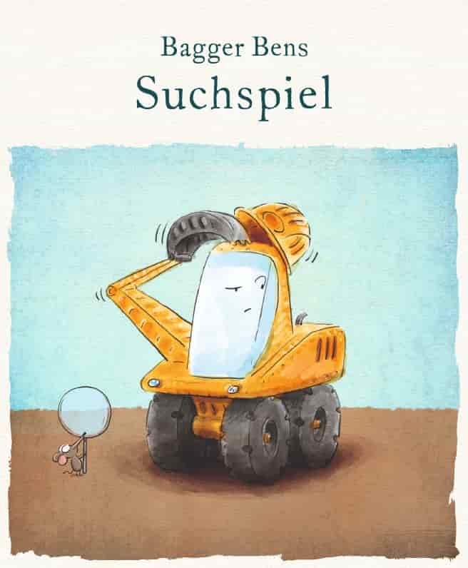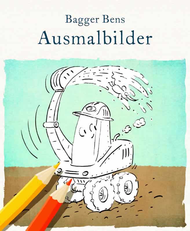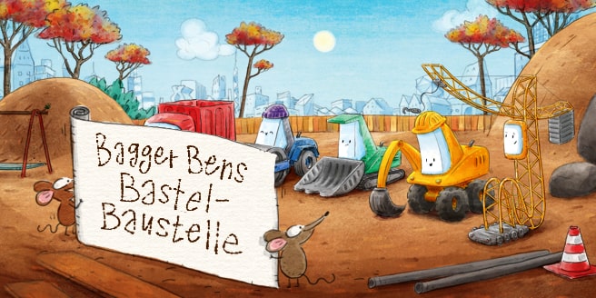 Kinderbuchcover mit Comic-Baufahrzeugen und Grünpflanzen. Titel: „Ein neuer Freund für Bagger Ben.