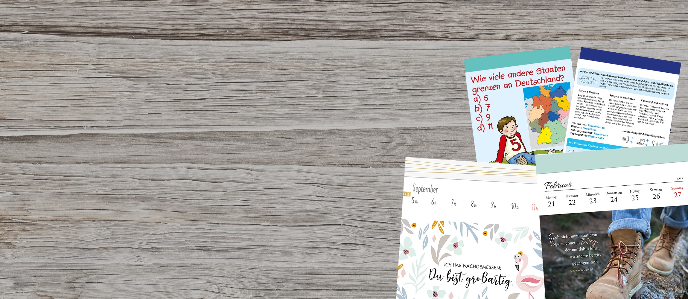 Jeden Tag am Ball bleiben mit täglich neuen Übungen aus den Tages-Abreißkalendern. Der Denksport-Kalender fördert die geistige Vitalität mit Rätseln und Logikaufgaben. Der Sprachlernkalender bietet Sprachlernübungen, Vokabeln und einen Online-Test.