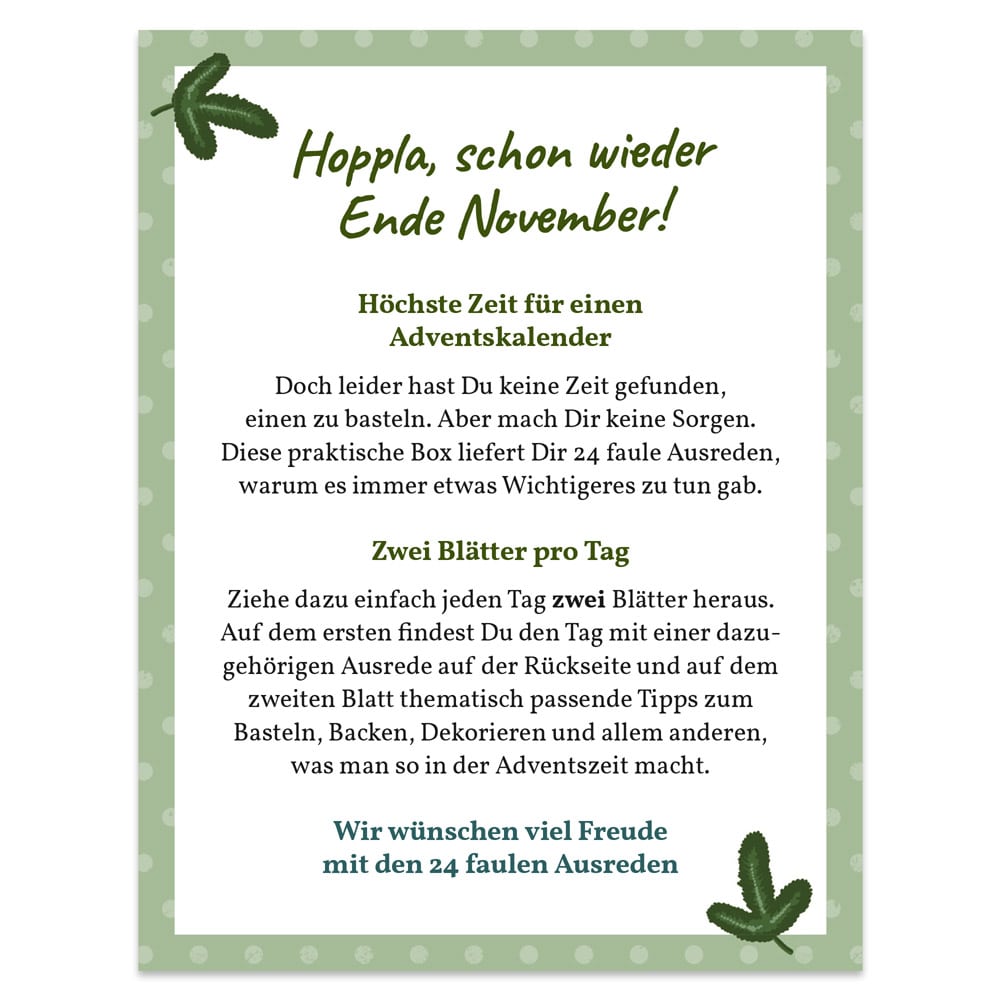 - 24 Ideen, Anregungen und Basteleien: Neben den Ausreden enthält die Box auch tolle Ideen, Anregungen und Basteleien, die echte Weihnachtsstimmung bringen. So wird die Adventszeit garantiert nicht langweilig!