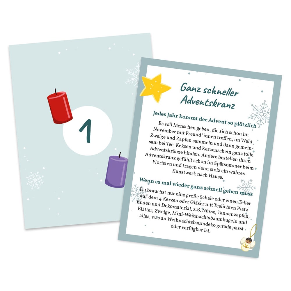 - Ziehen, freuen, Stimmung verbreiten: Mit dem herausziehbaren Mechanismus ist jede Karte eine Überraschung. Ziehe eine Karte, freue dich über die Ausrede oder die Idee und verbreite die Adventsstimmung weiter!
