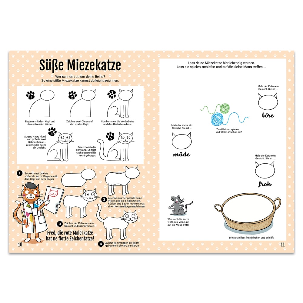 Niedliche Katze, schöne Blumen, frecher Affe, cooler Superheld, traumhaftes Schloss und noch viel mehr – lerne Schritt für Schritt und ganz einfach, wie du über 30 tolle Motive zeichnest.